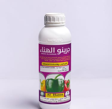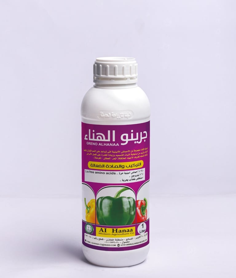 Greno Al-Hanaa is a blend (compound) of amino acids that promotes balanced and healthy plant growth, enhances response to fertilization, improves disease resistance, and boosts (enhance) tolerance to stress conditions (heat, drought, salinity).